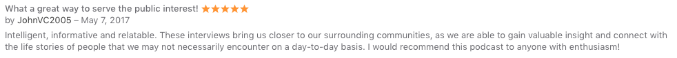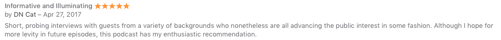 Ken Rubin[Your episode] was excellent. Your best interviewee, and you were at your best too. Your introduction was outstanding in presentation and substance. The microphone technical sounds were spot on.